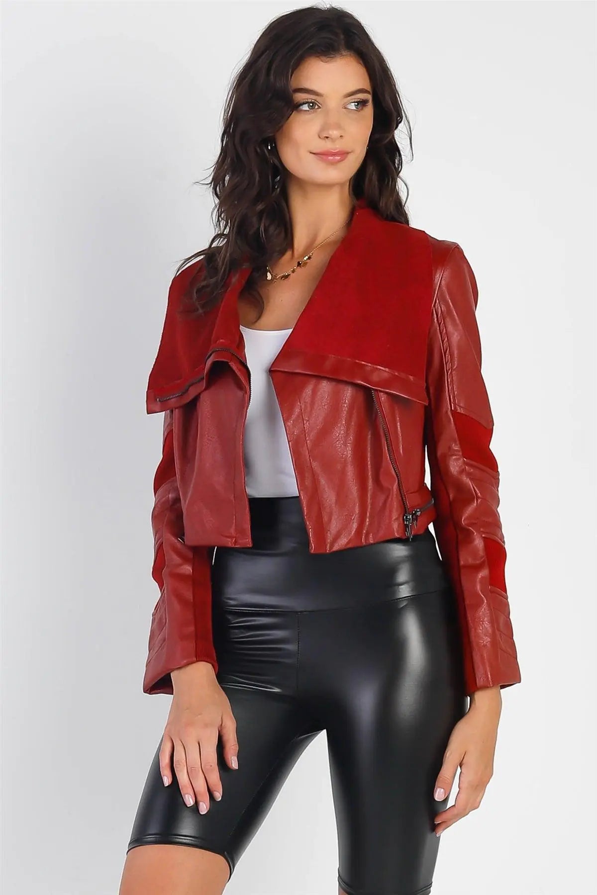 Burgundy Red Vegan Leather Structured Oblique Front Zipper Double Sided Suede Lapel Collar Cropped Jacket /1-2-1