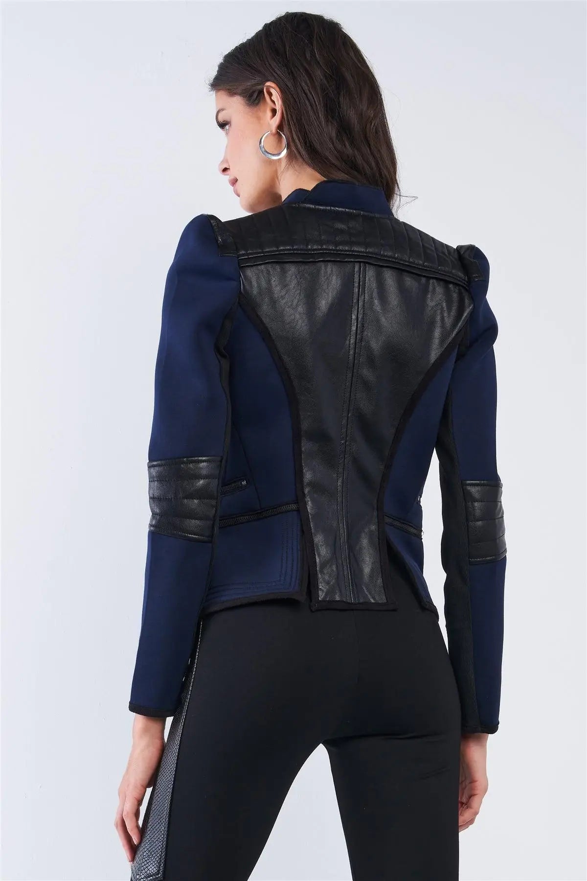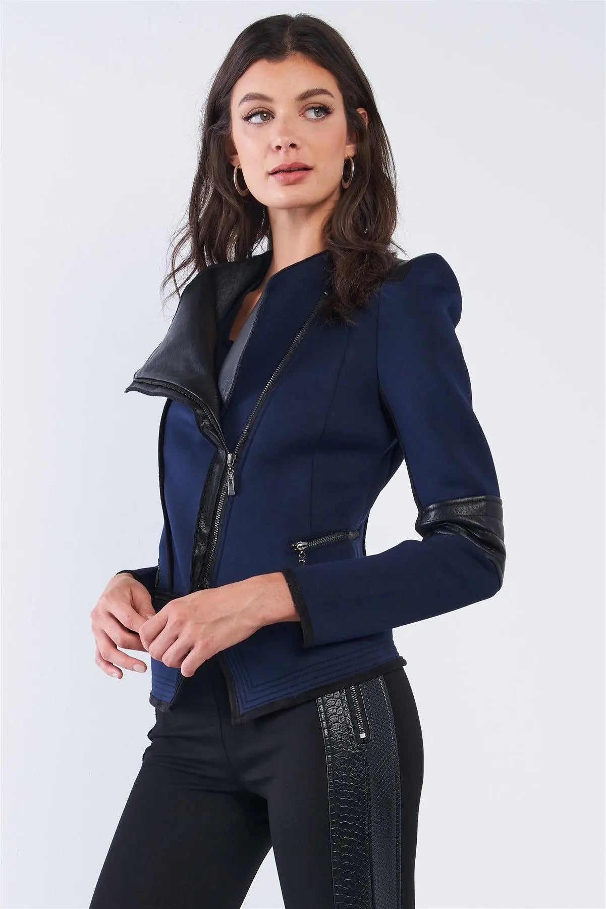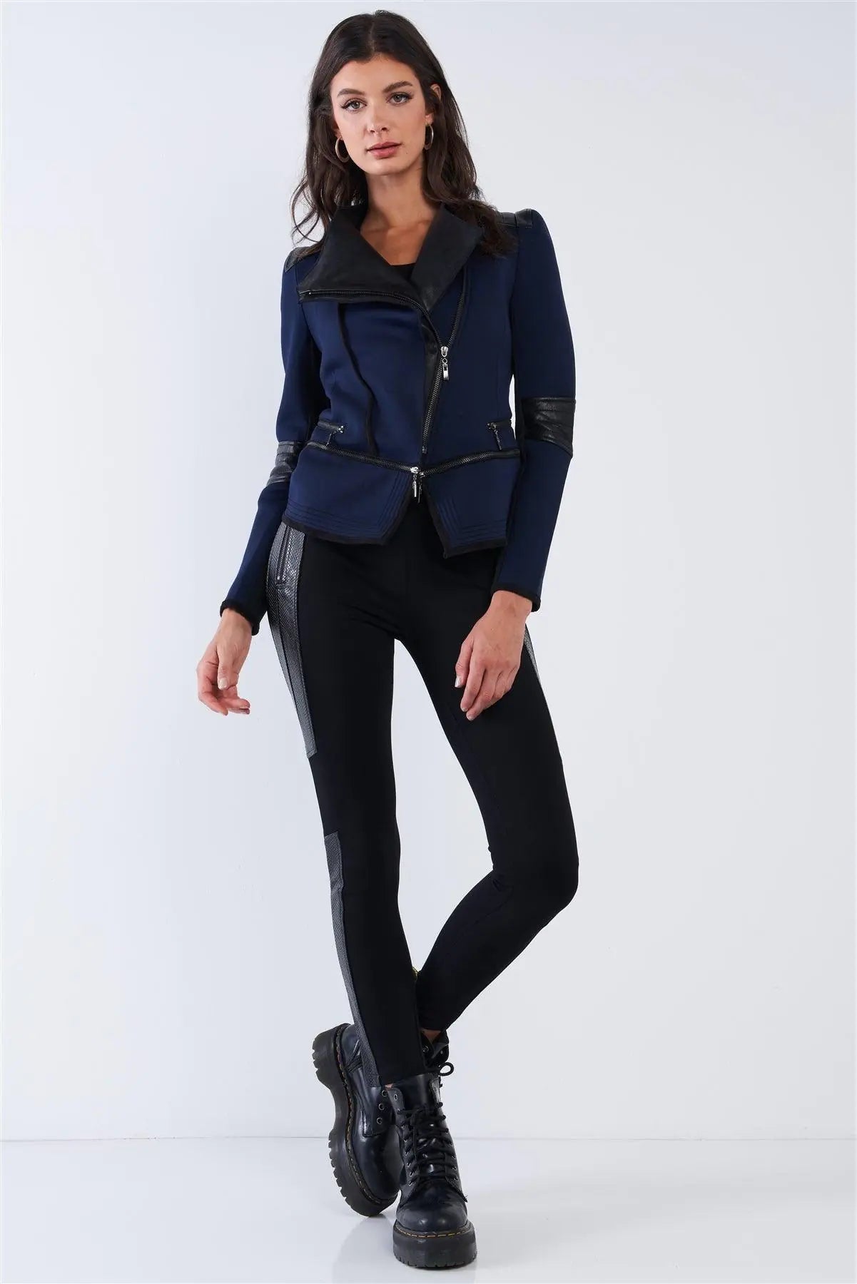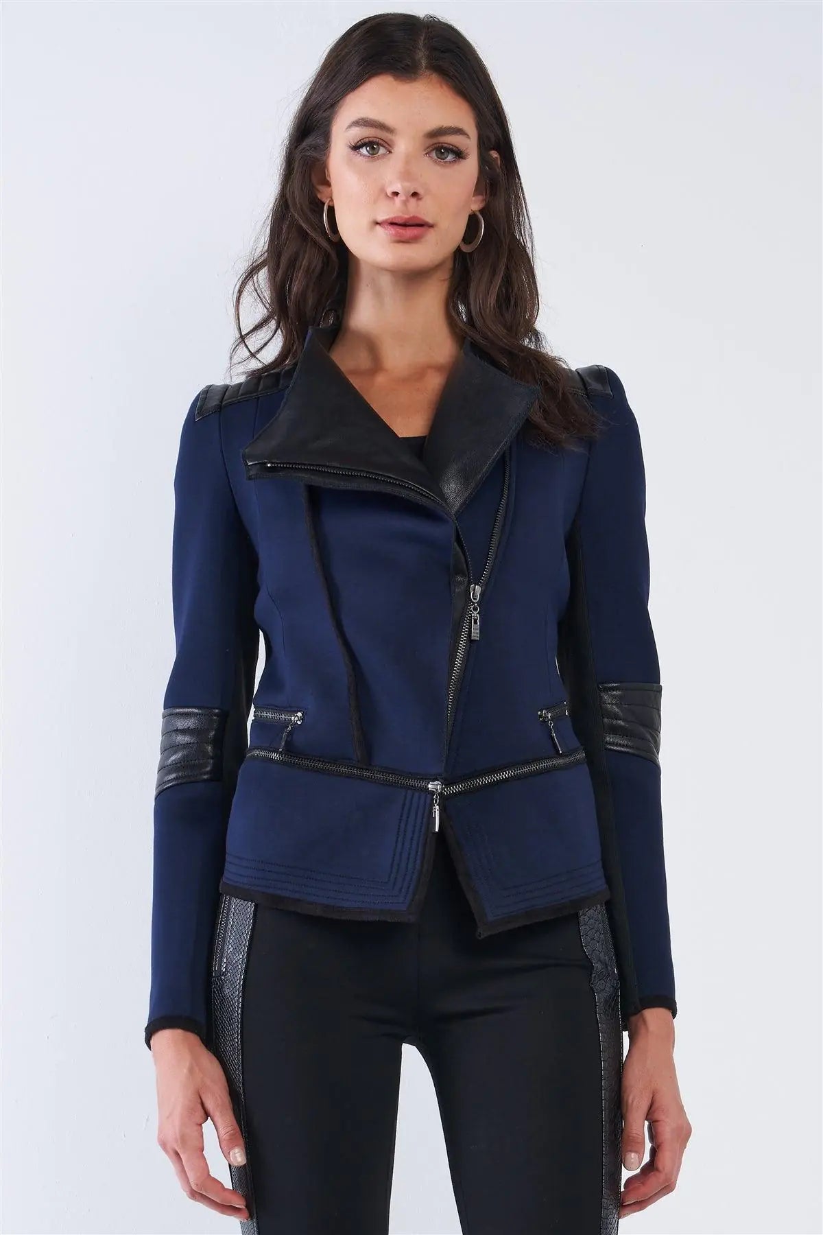 Rockstar Navy Blue Oblique Zipper Vegan Leather Jacket /2-2-2