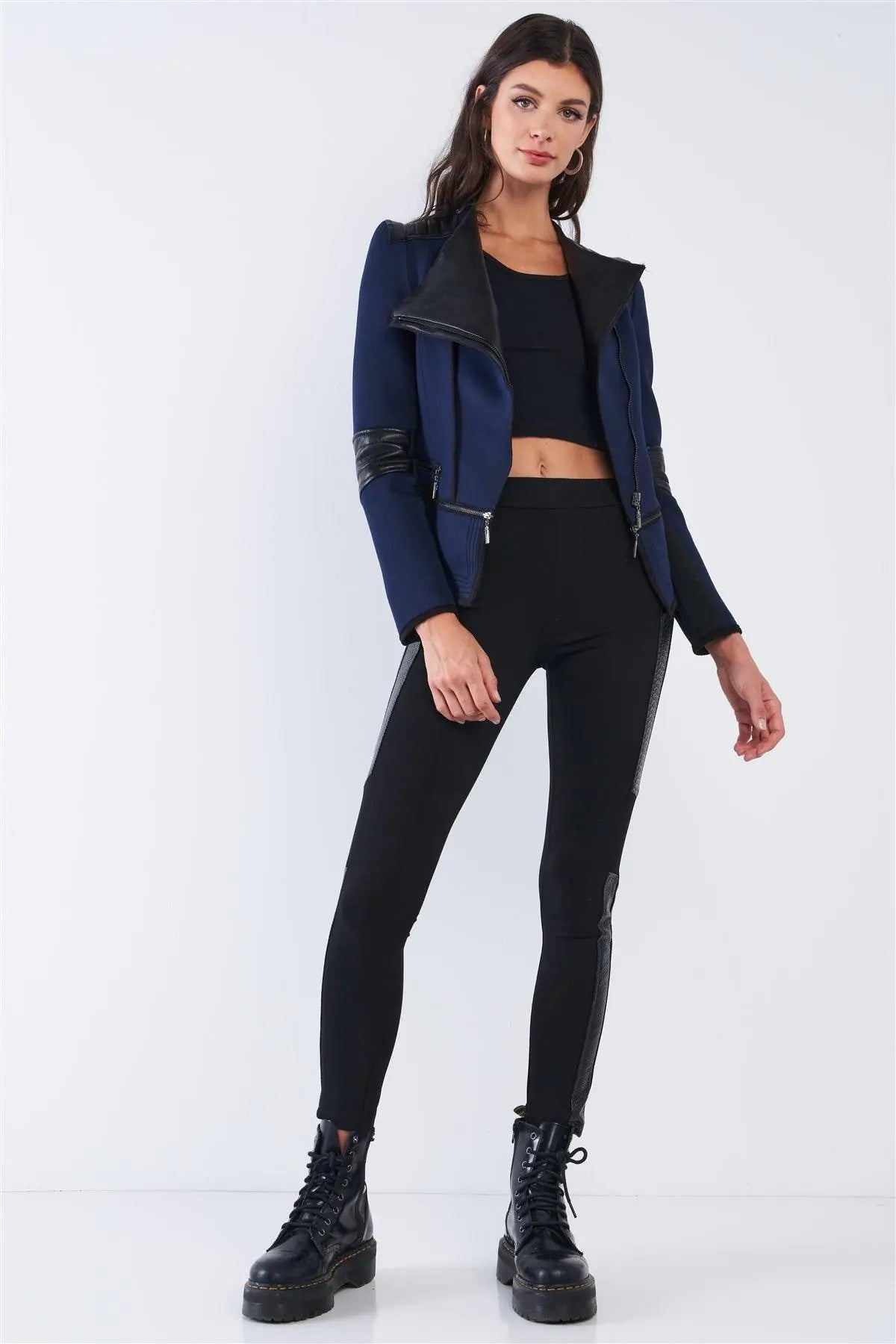 🖤 Item features: Navy blue, vegan leather cut-ins, multiple oblique zipper flies, decorative pockets, tight fitting, stylish, fall look.