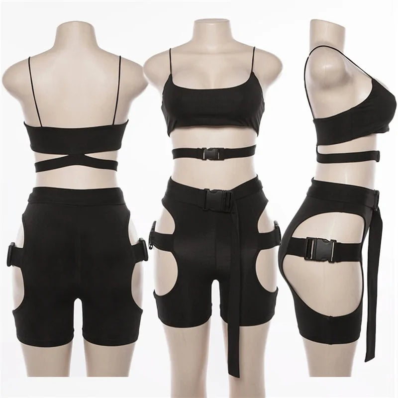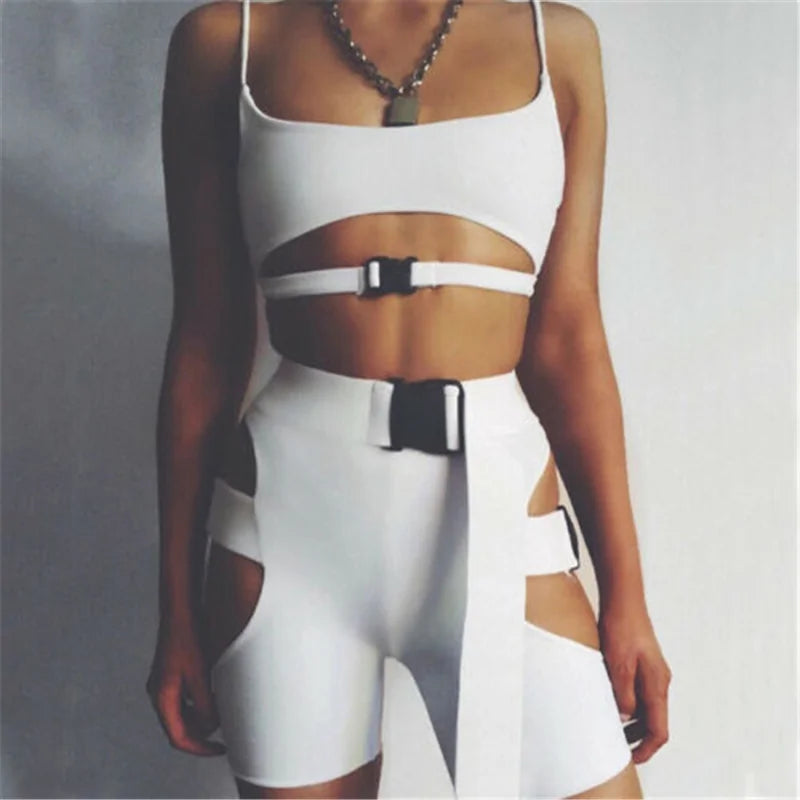 Featuring a sleeveless halter top with a regular fit and a daringly short length, this outfit exudes boldness. The button fly shorts, made from high-quality polyester, offer comfort and durability while adding a touch of rebellious charm to your look.